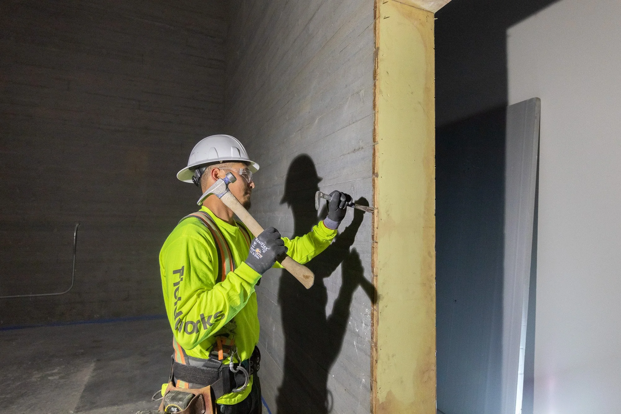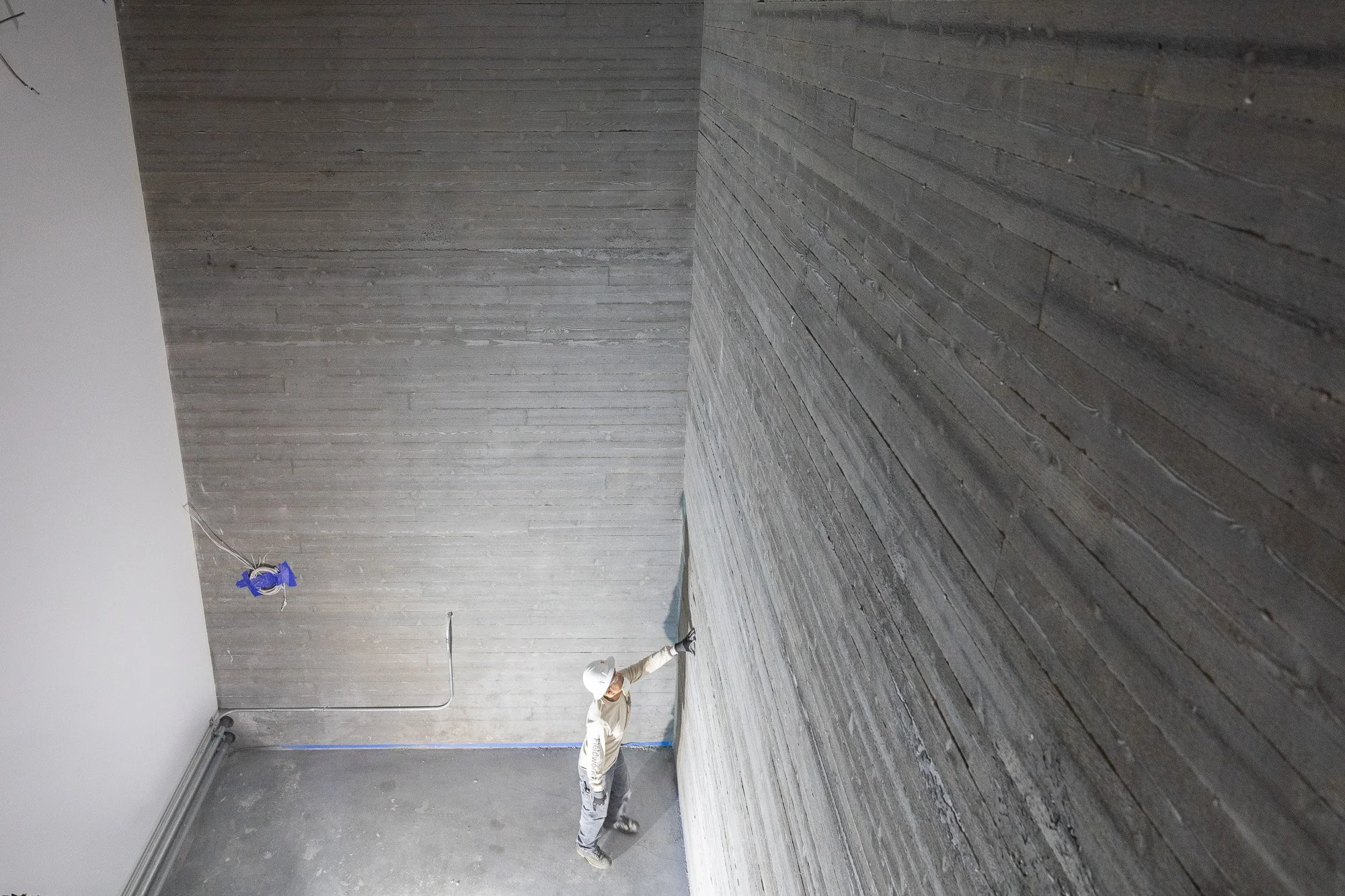 Four stories of interior board formed concrete in a Belltown commercial adaptive reuse project by MRJ Constructors. Pouring four stories inside an existing building provided some challenges. The grade beams and footings for the walls were poured with a line pump from the alley. The first wall lift was poured using a line pump from the alley and hose through the first floor and then lifted up and attached to the second floor framing so it could be moved around and dropped into forms from above. For the second lift (first to second floor) we used a small boom pump to raise the hose to the third floor windows then we connected 60’ of hose to the boom and ran it through the building.